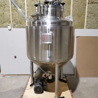 This reactor has a cone bottom and sits on load cells. It's approximately 100 gallons. The tank is 32" diameter x 41" deep overall (28" sidewall (24" jacket) & 13" cone). The jacket runs along the side and bottom of the tank. It has a domed top with a 18" manway. The manyway has 2 - 4.75" outside diameter sani clamp inlets. One is being used for a Rosemount pressure guage. The mixer also comes through the manway. Made by Eastern Mixers it's 230 / 460 volt, 3 ph, 1 hp. It has a 1" diameter shaft that goes to approximately 4" from the bottom. Before the jacket starts there are 2 more 4.75" outside diamter sani clamp connection inlets. One is being used as a site glass the other has a pressure relief valve. The outlet has an electric diaphragm valve on it made by Asepco (serial E31224). It's a 2" outside diameter sani clamp connection that's 13" from the floor but it would be a little if you used the load cells. Vessel & jacket max allowable pressure 50 / FV psi @ 300 deg F. Vessel & jacket min design metal temp -20 deg F @ 50 / FV psi. National board #648. In very good condtion. Last used in a neutraceutical facility.