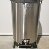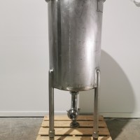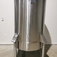 Stainless steel tank on a stainless frame. This tank has a 1 piece removable lid. The lid has a 20" diameter manway / inlet and 2 cut outs for mixing shafts. The tank has a slant bottom with bottom side discharge. The tank is 30" diameter x 38.5" deep (40.75" deep at the outlet). Approximately 140 gallons. The outlet is a 2" outside diameter sani clamp connection that is 15.5" from the floor. In good condition (the top edge has been repaired). Last used in a pharmaceutical facility.