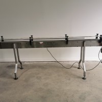 This 90 degree conveyor is 6' long at the infeed and 12' long from the 90 to the end. The conveyor is currently on an incline and goes from 16" to a discharge height of approximately 28". The belt is a 7.5" wide table top chain. The conveyor channel is stainless steel with a single guide rail running the length. In good condition.