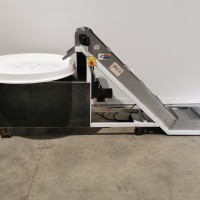Incline take away conveyor with turntable. The conveyor belt is made by Intralox and is 12" wide and has 2" high cleats that are 15" apart. The side walls of the conveyor are 1.25" tall. It has a dished 38" diameter turntable that's 37.5" from the floor. Variable speed controler. The casters need replacing. Last used in a food facility. In good working condition.