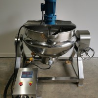 All stainless steel self contained scrape surface kettle. 31.5" diameter x 14" deep to the top of the mixing blade (20" deep to the to the bridge). Approximately 35 gallons. The mixing shaft is removable for cleaning. I has a hand crank to tilt. The spout is 7" from the floor when fully tilted. Digital screen display. Looks to have never been used or very little use. Comes out of a food facility.