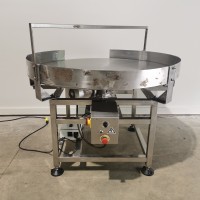 47" diameter stainless steel turntable. It has 4.25" tall side rails. Variable speed controls. It's currently 30.5" from the floor but has height adjustable legs. In good working condition. Last used in a food facility.