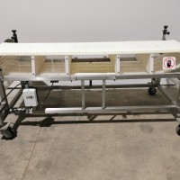 All stainless steel conveyor with white Intralox belt. The belt is 16" wide x 72" long and is 28.5" from the floor. On casters. In good working condition. Last used in a food facility.