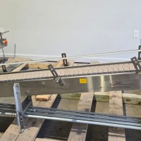 This 90 degree conveyor is 6' long at the infeed and 12' long from the 90 to the end. The conveyor is currently on an incline and goes from 16" to a discharge height of approximately 28". The belt is a 7.5" wide table top chain. The conveyor channel is stainless steel with a single guide rail running the length. In good condition.