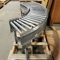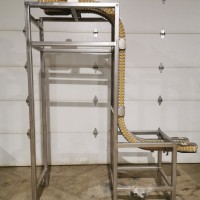 This 90 degree conveyor is 6' long at the infeed and 12' long from the 90 to the end. The conveyor is currently on an incline and goes from 16" to a discharge height of approximately 28". The belt is a 7.5" wide table top chain. The conveyor channel is stainless steel with a single guide rail running the length. In good condition.
