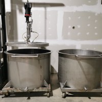 Two identical 1250 litre (330 gallon) stainless steel single wall tanks with an ARO two ball piston pump with a follower plate. The tanks are 52" inside diameter (with a 3" lip) x 36.75" deep. They both have a 2" outside diameter camlock fittings. There is 1 cap fitting. The outlets are 9.75" from the floor. The tanks are on a 50" x 50" square frame on casters. One frame is mild steel the other is stainless steel. Each tank has a handle on one end. Overall the tanks are 46.75" high. The pump is air operated and lowers into the tank as it pumps out. There is no hoist with the pump. The pump is made by ARO model AF0660, serial SPD1144169. Max inlet pressure is 150 psi. Max outlet pressure is 635 psi. In good working condition. Last used pumping hand cleaner.